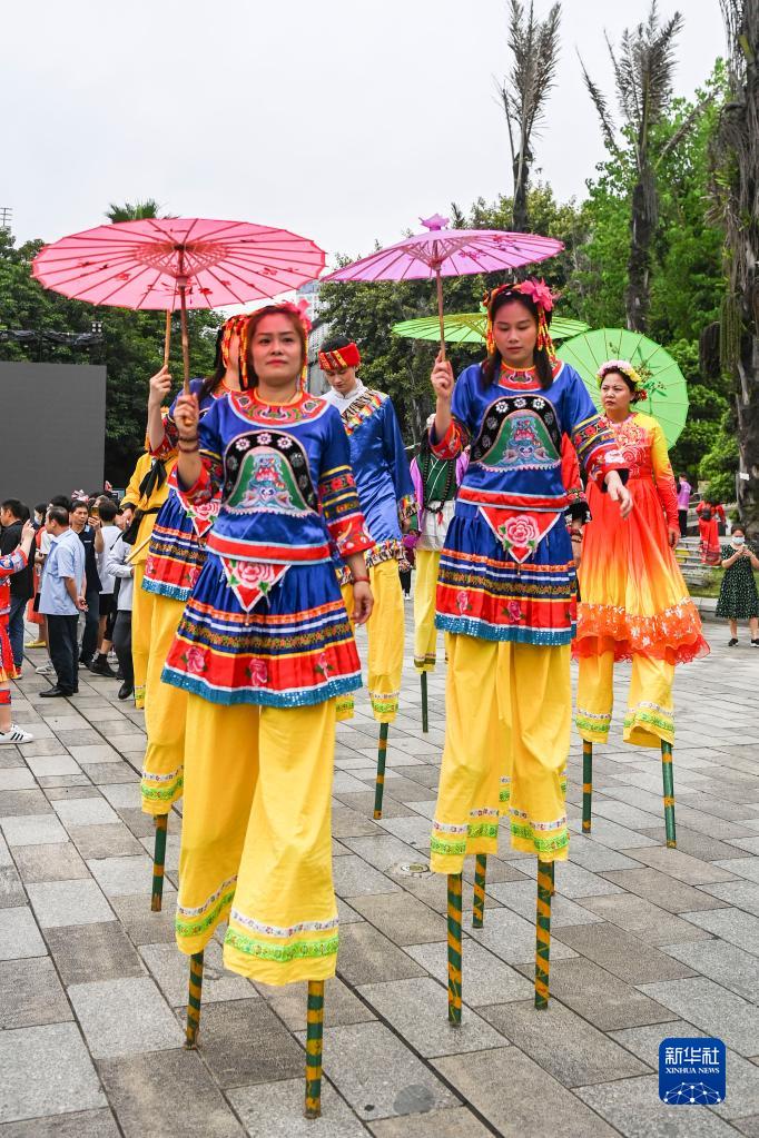 4月22日,在中国—东盟(南宁)非物质文化遗产周开幕现场,演员在表演踩高跷。 当日,中国—东盟(南宁)非物质文化遗产周在广西南宁市开幕。在为期7天的时间内,将有来自国内外的150多项非物质文化遗产项目进行展演,广大市民和游客可以近距离体验中国和东盟国家非遗精品项目的魅力。 新华社记者 曹祎铭 摄