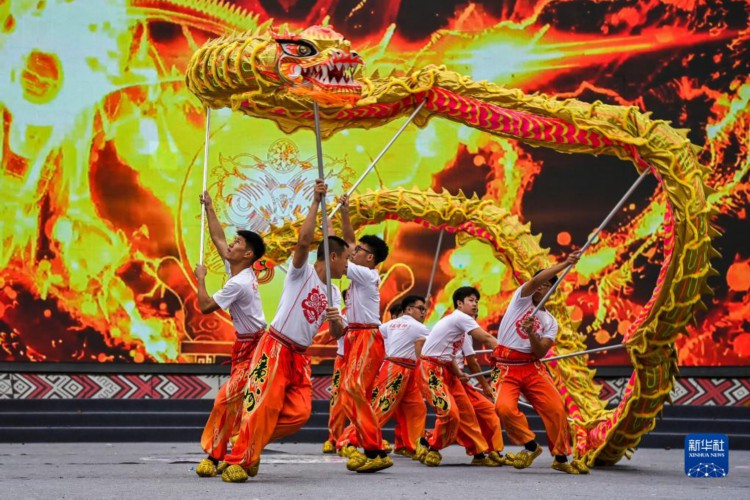 4月22日,在中国—东盟(南宁)非物质文化遗产周开幕现场,演员在表演舞龙。 当日,中国—东盟(南宁)非物质文化遗产周在广西南宁市开幕。在为期7天的时间内,将有来自国内外的150多项非物质文化遗产项目进行展演,广大市民和游客可以近距离体验中国和东盟国家非遗精品项目的魅力。 新华社记者 曹祎铭 摄