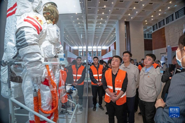 4月23日,中建三局顺义航天产业园项目一线建设者在参观“逐梦寰宇问苍穹——中国载人航天工程三十年成就展”。