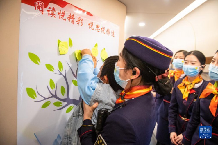 4月23日,在由株洲西发往上海虹桥的G1348次列车上,广铁集团长沙客运段动二车队举办好书阅读分享会活动,小乘客在列车上分享阅读绘本后的感受。