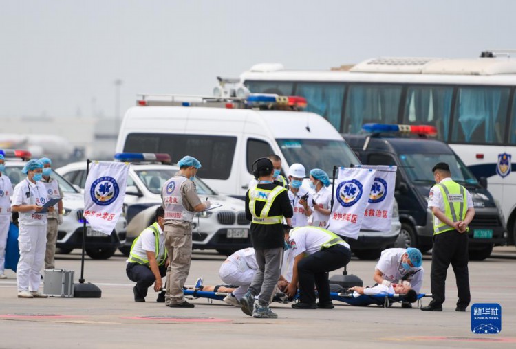 4月23日,在深圳机场举行的演练中,医务人员模拟对受伤的乘客进行检查。 当日,“守护2023”深圳宝安国际机场应急救援综合演练在深圳举行。此次演练内容按照民航局印发的《民航跨部门联合实战化应急演练工作指南》进行设置,包括航空安保威胁信息接收与处置、空中疑似爆炸物处置与地面救援力量快速响应、响应升级与应急救援指挥体系搭建、跨部门联合响应、海上应急集结、外部力量增援、航空器搜排爆与疑似爆炸物处置、事件调查、航空器搬移等18个课目,有13家单位共300余人参与演练。 新华社记者 毛思倩 摄