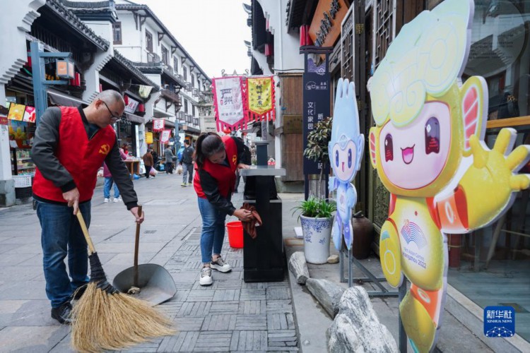 4月24日,在建德市梅城镇古街,社区党员干部、志愿者在打扫古镇卫生。