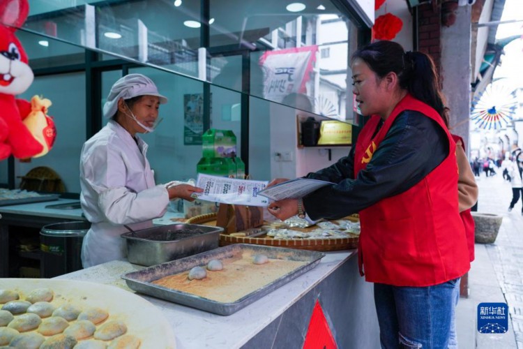 4月24日,在建德市梅城镇古街,志愿者在进行亚运知识宣传。