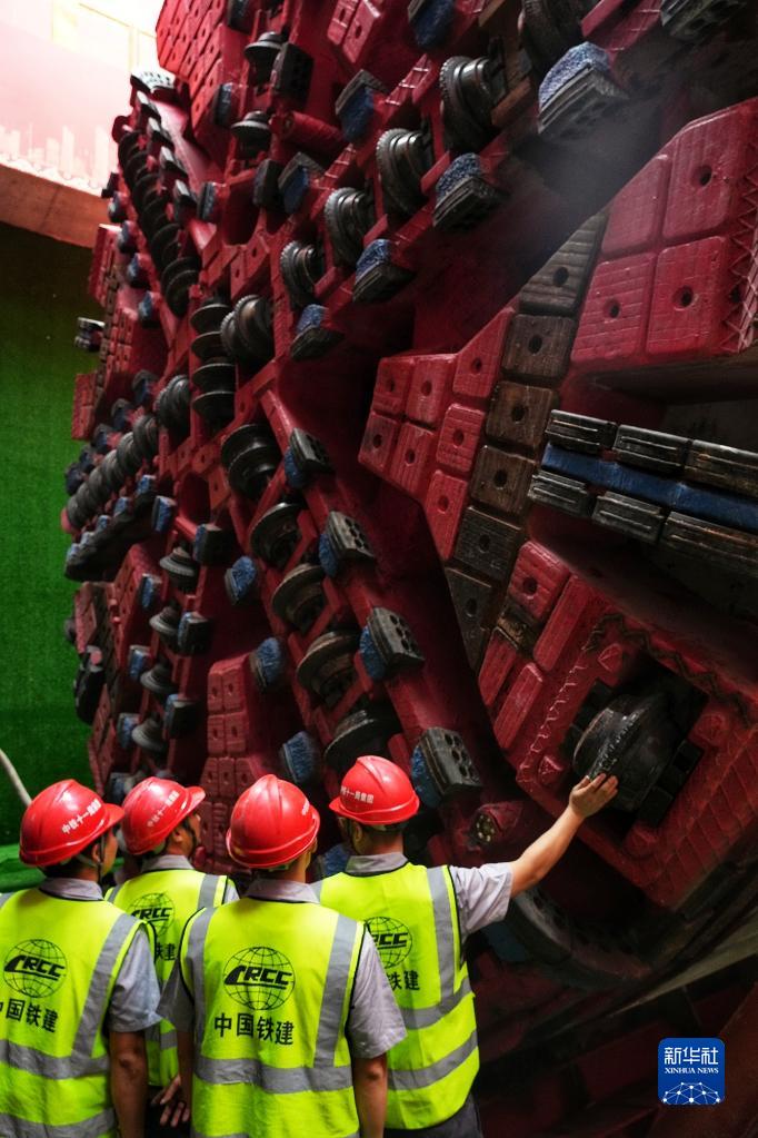 4月24日,中铁十一局技术人员检查准备始发的“铁兵广花13号”盾构机刀盘。 当日,广(广州东)花(花都天贵)城际铁路全线首台盾构始发,中铁十一局“铁兵广花13号”盾构机开始执行白云城市中心至白方盾构井区间右线隧道掘进任务。 作为粤港澳大湾区城市轨道交通线网的骨干线路,广花城际将和广州地铁十八号线、二十二号线、芳白城际及南珠(中)城际一起联通大湾区西岸重要区域和交通枢纽。 新华社记者 刘大伟 摄