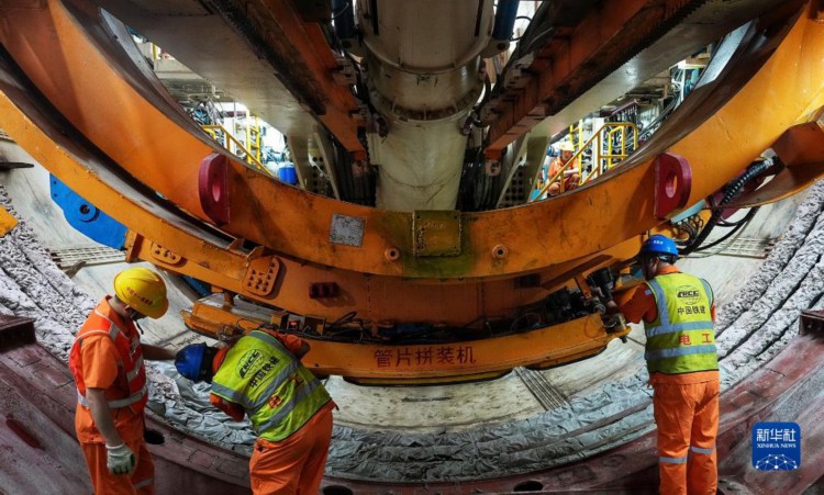4月24日,中铁十一局技术人员检查准备始发的“铁兵广花13号”盾构机的管片拼装机。 当日,广(广州东)花(花都天贵)城际铁路全线首台盾构始发,中铁十一局“铁兵广花13号”盾构机开始执行白云城市中心至白方盾构井区间右线隧道掘进任务。 作为粤港澳大湾区城市轨道交通线网的骨干线路,广花城际将和广州地铁十八号线、二十二号线、芳白城际及南珠(中)城际一起联通大湾区西岸重要区域和交通枢纽。 新华社记者 刘大伟 摄