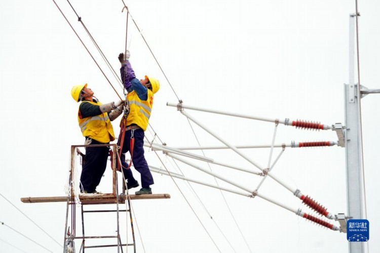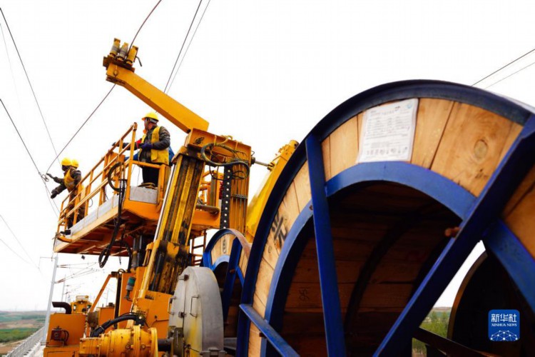 4月25日,在莱荣高铁莱阳南站至海阳站区间,中铁电气化局的工作人员在进行接触网作业。