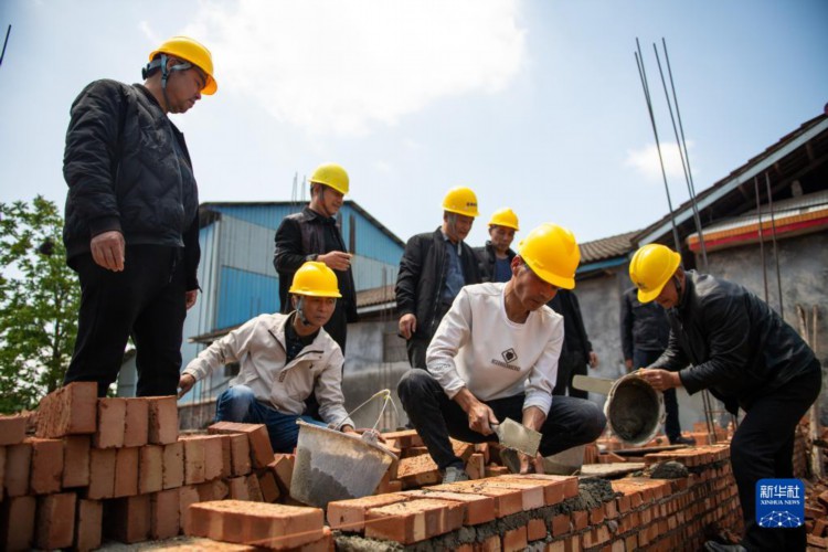 4月25日,在大鲸港镇五合剅社区,工人在实操砌墙。