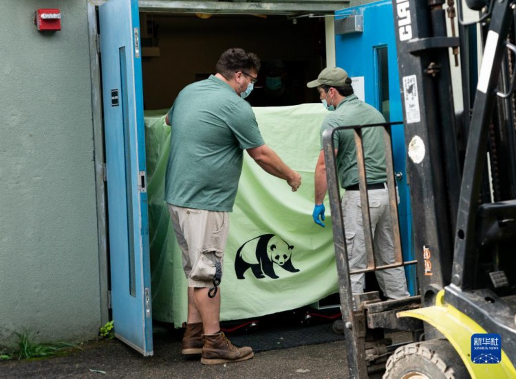 4月26日,工作人员在美国田纳西州孟菲斯动物园搬运装载大熊猫“丫丫”的箱笼。