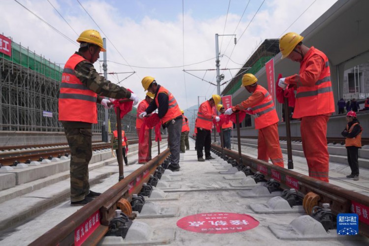 4月26日,在昌景黄高铁浮梁东站,工作人员在紧固螺栓,将对接好的钢轨固定。
