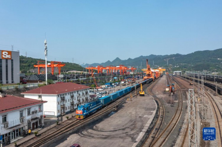 4月27日,太平船务——西部陆海新通道江铁海联运非洲专列从重庆果园港鱼嘴站成功驶出(无人机照片)。
