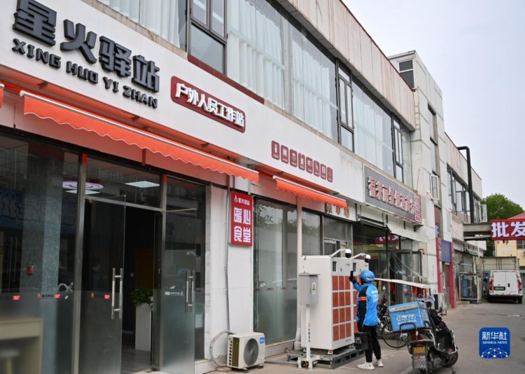 这是天津市东丽区星火驿站一景(4月27日摄)。 近日,天津市东丽区首家星火驿站在张贵庄街道劝东商业街投入使用。这个约60平方米的临街室内空间配备有空调、微波炉、饮水机、充电宝、医药箱等设施,可为户外工作者提供取暖避暑、吃饭休憩等暖心便利服务。 新华社记者 李然 摄
