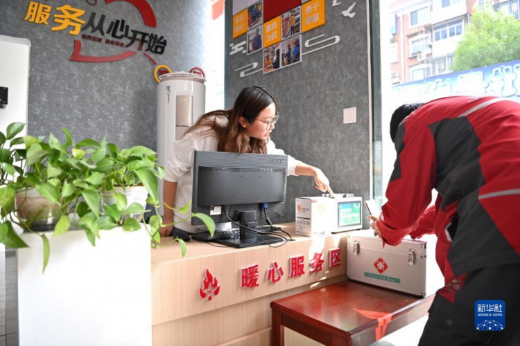 4月27日,快递小哥在星火驿站借用充电宝。 近日,天津市东丽区首家星火驿站在张贵庄街道劝东商业街投入使用。这个约60平方米的临街室内空间配备有空调、微波炉、饮水机、充电宝、医药箱等设施,可为户外工作者提供取暖避暑、吃饭休憩等暖心便利服务。 新华社记者 李然 摄