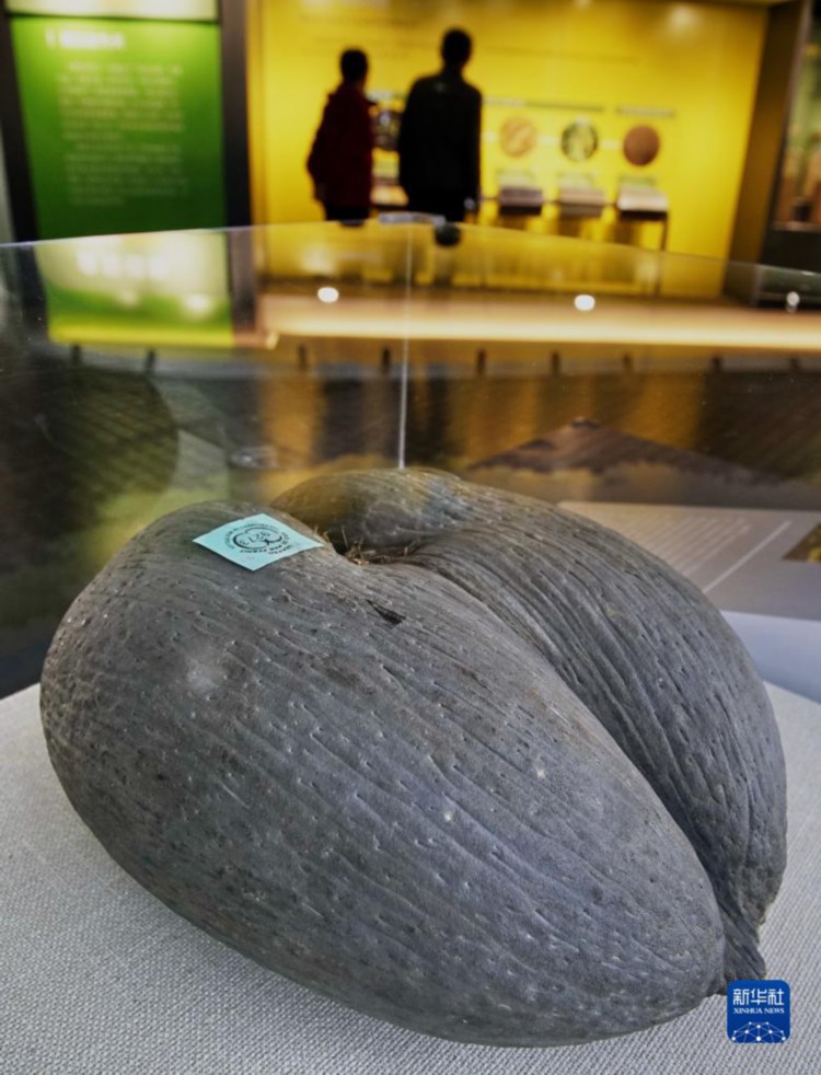 这是4月27日在国家植物园拍摄的海椰子种子。 2022年4月18日,国家植物园在北京正式揭牌。如今,国家植物园已完成植物种类资源本底调查,共收集世界各地的植物1.7万余种,其中珍稀濒危植物近千种,收藏植物标本突破300万份。 新华社记者 李欣 摄
