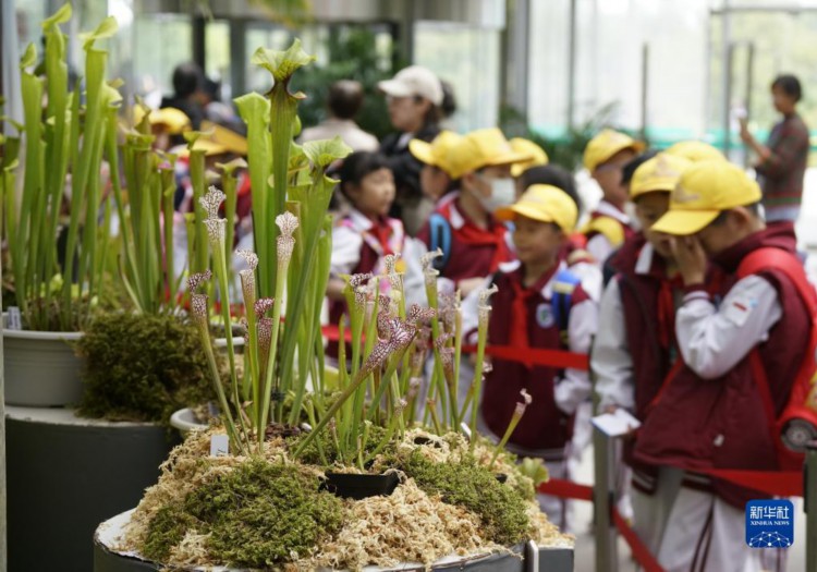4月27日,学生们在国家植物园温室参观瓶子草。 2022年4月18日,国家植物园在北京正式揭牌。如今,国家植物园已完成植物种类资源本底调查,共收集世界各地的植物1.7万余种,其中珍稀濒危植物近千种,收藏植物标本突破300万份。 新华社记者 李欣 摄