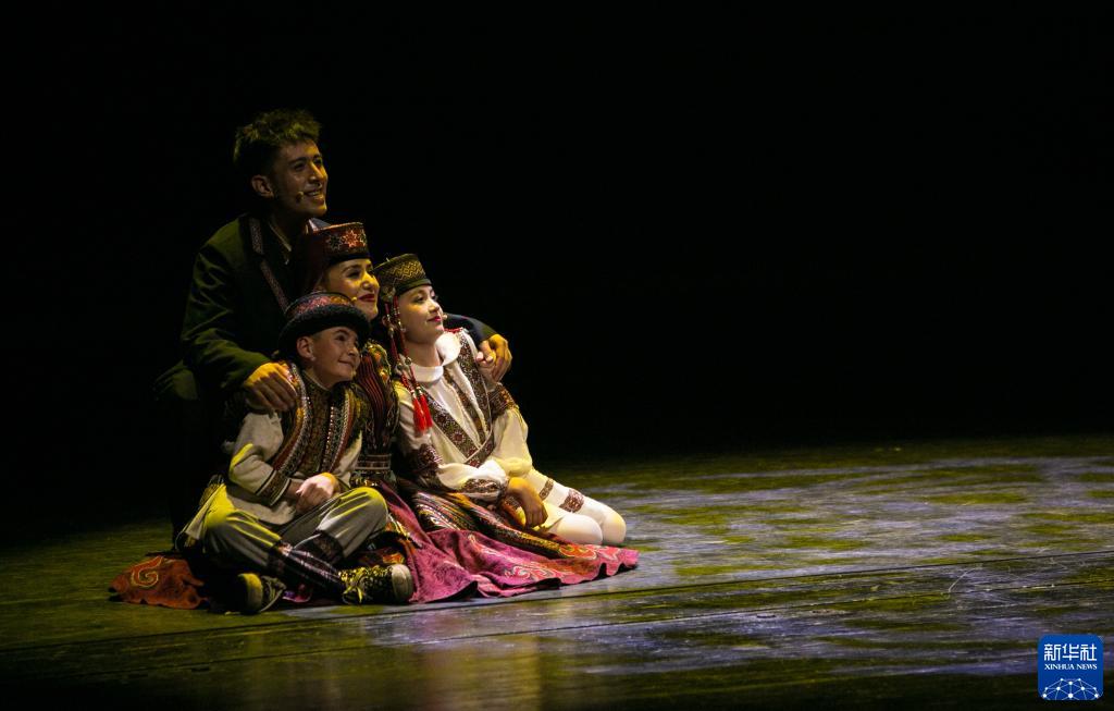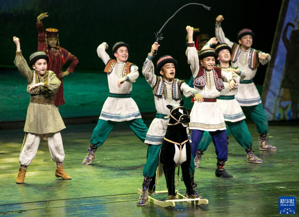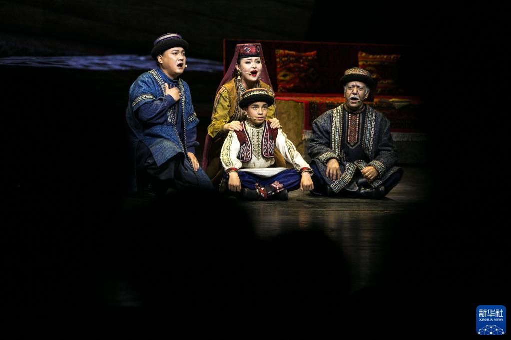 4月29日,在北京保利剧院,演员在音乐剧《拉齐尼·巴依卡》第一幕《帕米尔少年》中表演。 4月26日至29日,新疆喀什本土音乐剧《拉齐尼·巴依卡》在北京保利剧院上演,以全国优秀共产党员、“时代楷模”拉齐尼·巴依卡为创作原型,生动还原了他的事迹。 新华社记者 李京 摄