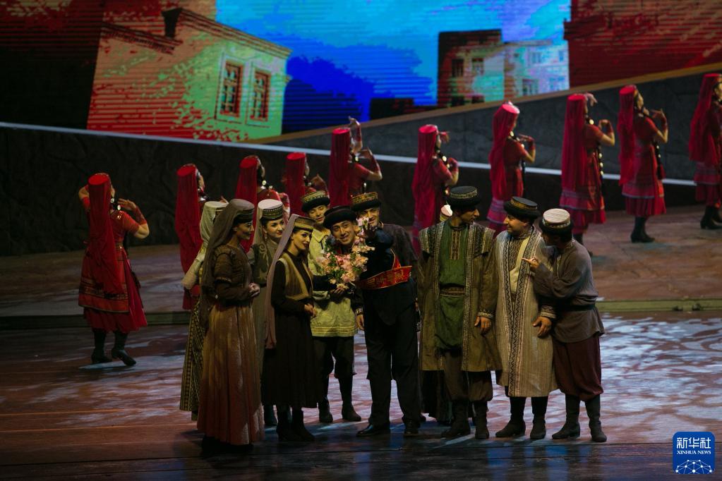 4月29日,在北京保利剧院,演员在表演音乐剧《拉齐尼·巴依卡》。 4月26日至29日,新疆喀什本土音乐剧《拉齐尼·巴依卡》在北京保利剧院上演,以全国优秀共产党员、“时代楷模”拉齐尼·巴依卡为创作原型,生动还原了他的事迹。 新华社记者 李京 摄