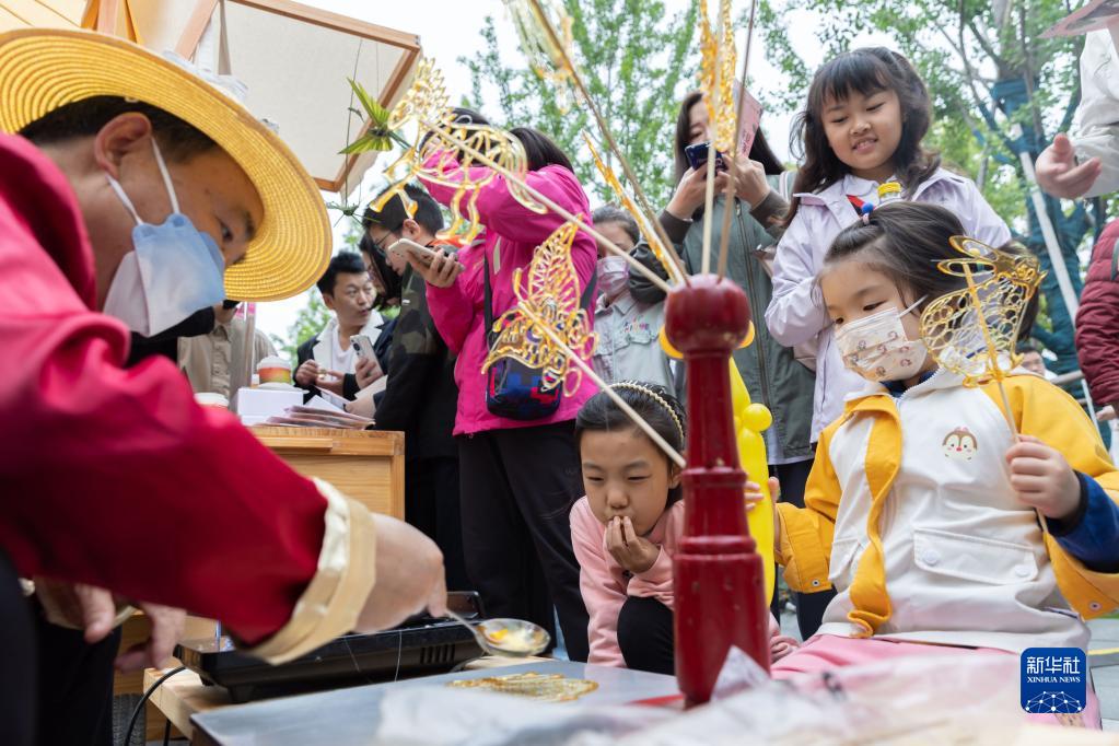 4月29日,小朋友在龙华庙会上观看民俗糖画。