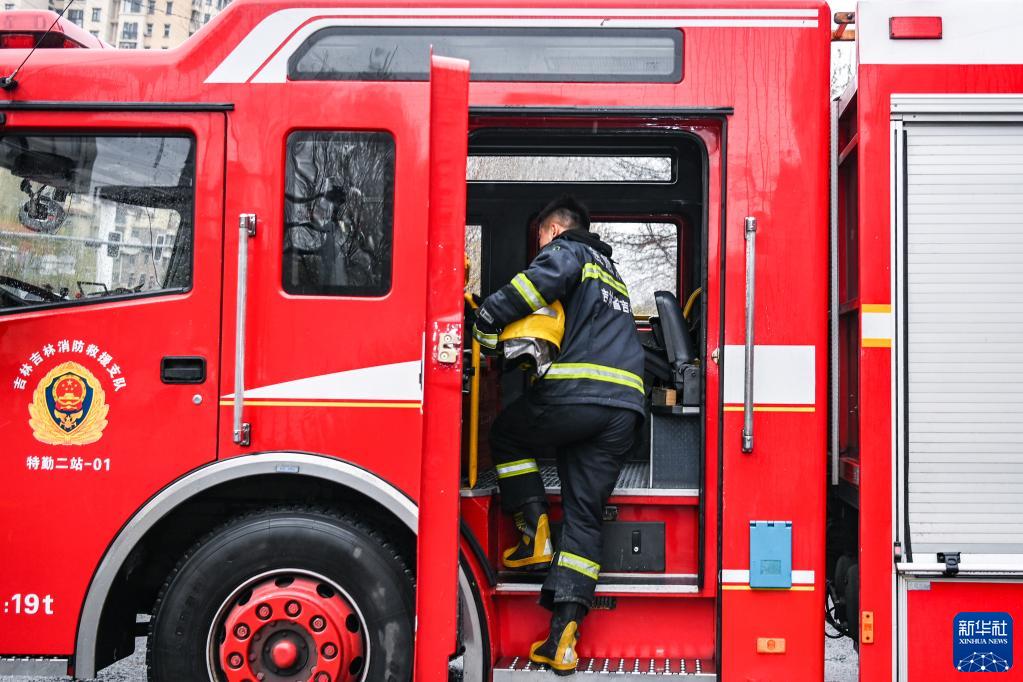 吉林省吉林消防救援支队特勤大队二站消防员孟祥一登上消防车(2023年4月28日摄)。
