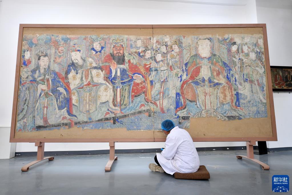 在山西省大同市云冈石窟研究院壁画文物修复室,工作人员在修复壁画(2021年5月9日摄)。