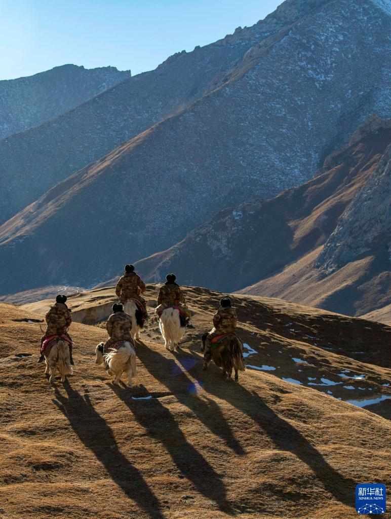 在昆仑山腹地,新疆生产建设兵团第三师图木舒克市叶城二牧场三连职工骑着牦牛行进在巡边路上(2020年12月25日摄)。