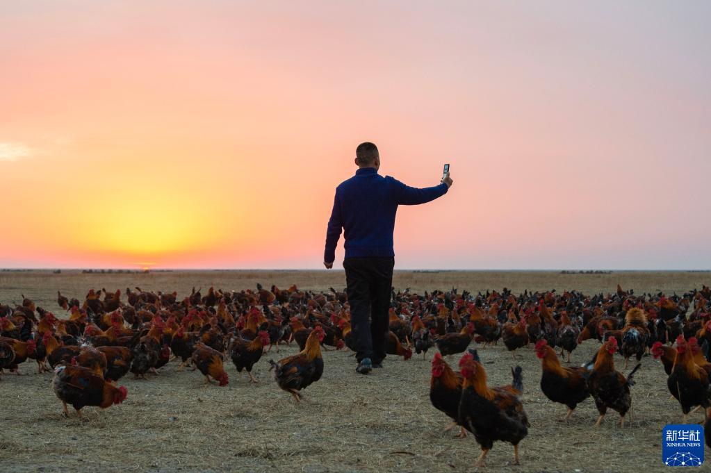 在黑龙江省明水县的草原上,返乡创业、带领当地村民增收的军蕊溜达鸡产品有限公司负责人桑庆军在进行网络直播(2019年10月30日摄)。