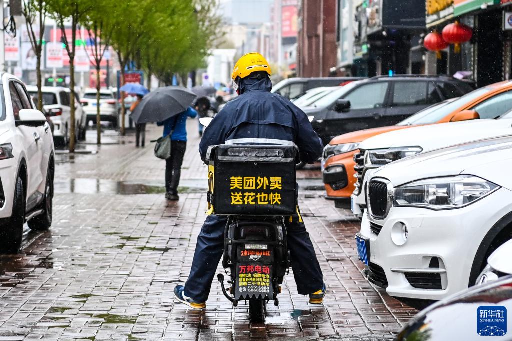 在吉林省吉林市,一名外卖小哥在雨中配送外卖(2023年4月28日摄)。