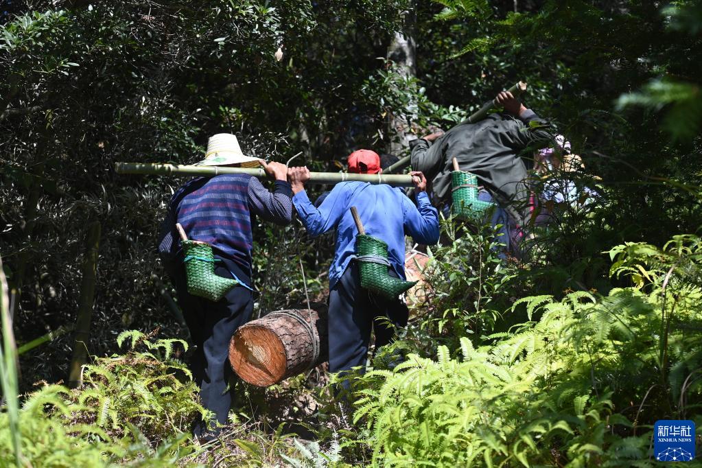 广西融水苗族自治县杆洞乡乌英苗寨群众在合力抬木头,准备建设村中设施(2022年11月3日摄)。