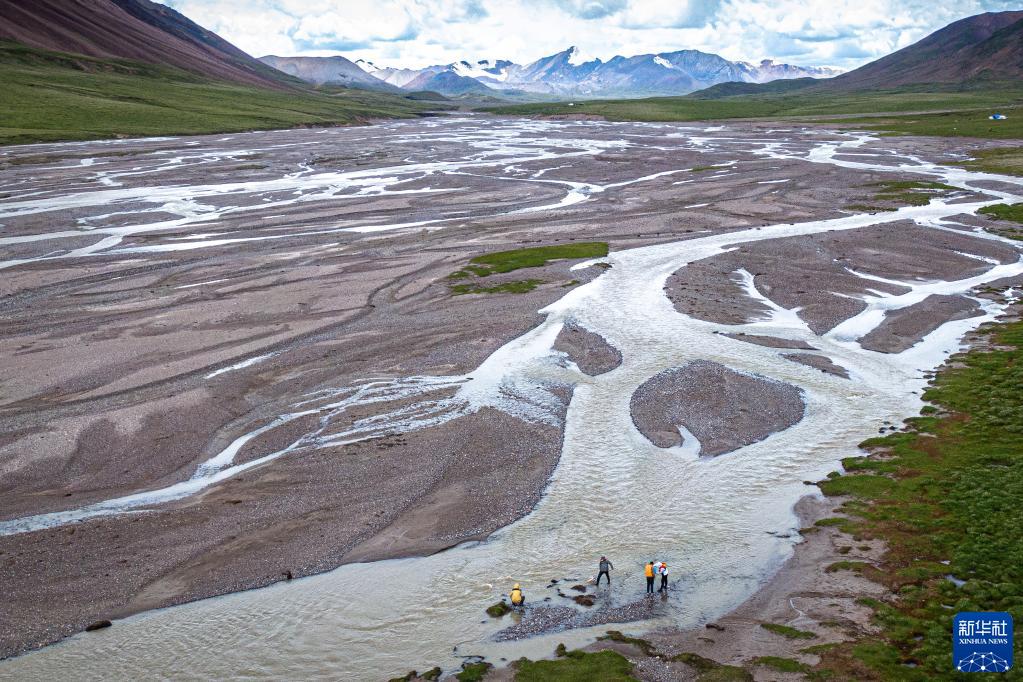 来自长江科学院的科考队员在长江源区采集水样(2022年7月26日摄,无人机照片)。