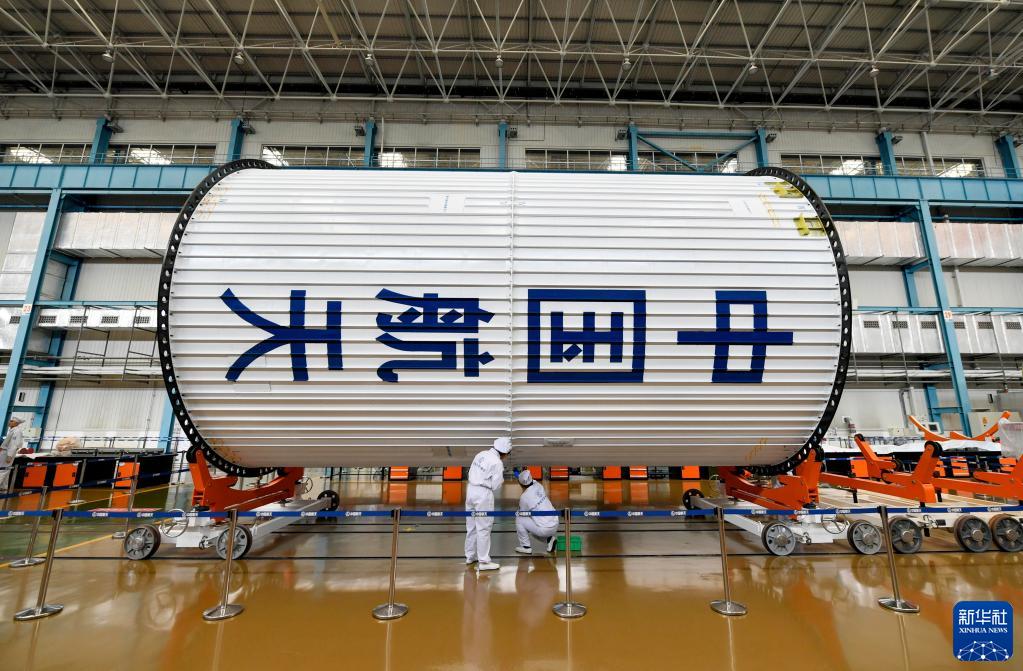 在航天科技集团一院天津火箭公司总装测试车间,装配一组班组成员在进行火箭装配(2023年4月19日摄)。