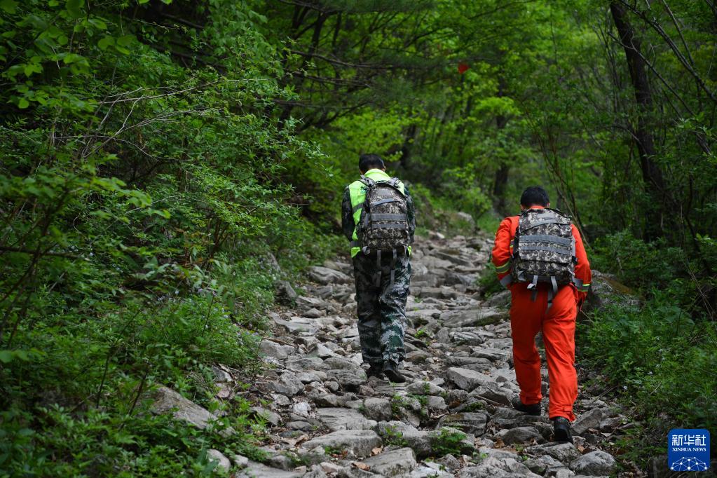 陕西省西安市鄠邑区涝峪国有生态林场护林员在秦岭营盘沟巡查(2022年4月27日摄)。