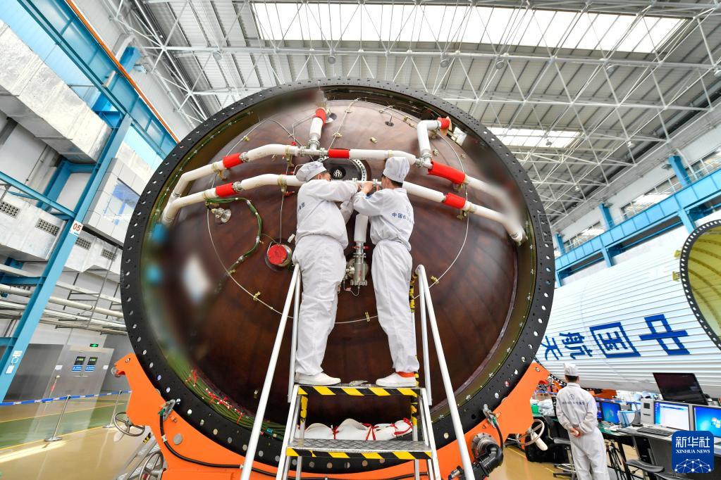 在航天科技集团一院天津火箭公司总装测试车间,班组人员在进行火箭装配(2023年4月19日摄)。