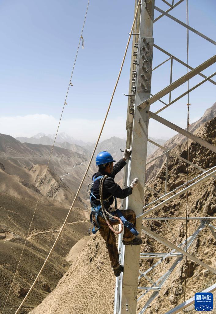 参与新疆叶城县西合休乡通电工程的工人在昆仑山中攀爬铁塔(2020年4月29日摄)。