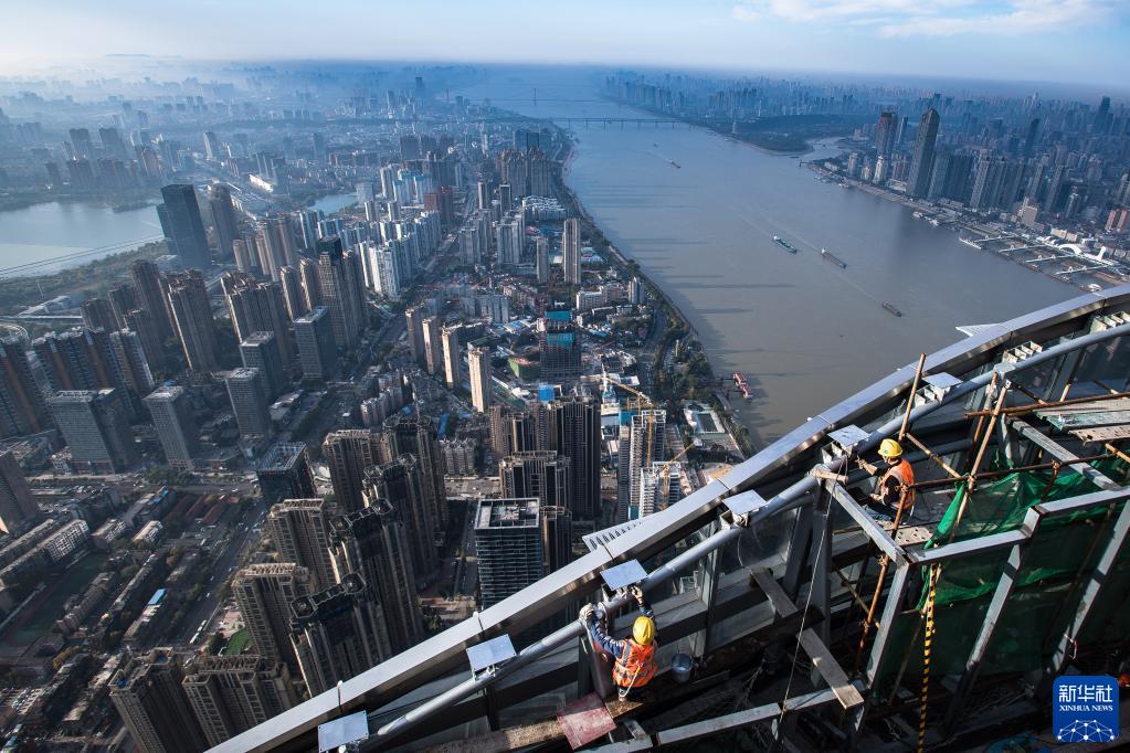 在湖北省武汉市一处建筑工地,工人在进行高空作业(2021年11月15日摄)。
