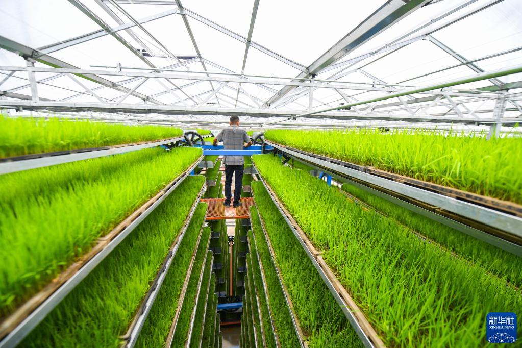 在四川省眉山市彭山区数智水稻示范基地,当地种粮大户王程淋在查看循环式智能育秧机上的秧苗长势(2023年4月20日摄)。