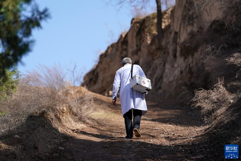 在山西省吕梁市石楼县和合乡铁头村,村医张尚保走在出诊的路上(2021年3月23日摄)。
