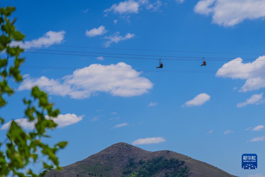 4月30日,游客在河北省遵化市一景区体验空中索道游乐项目。
