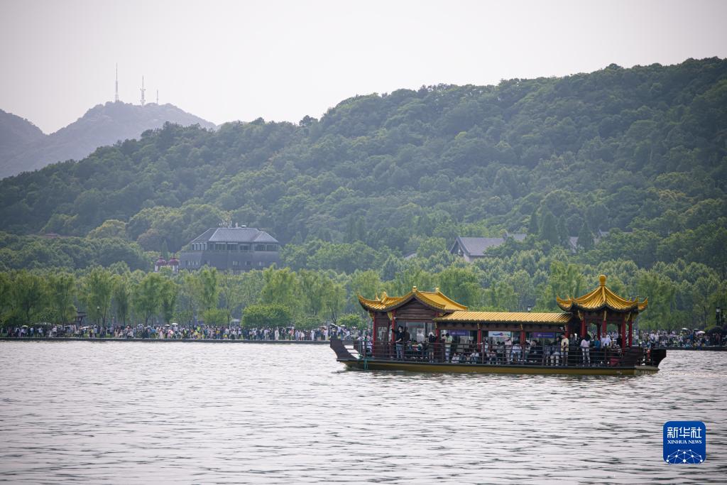 4月30日,满载游客的游船行驶在杭州西湖水面上。