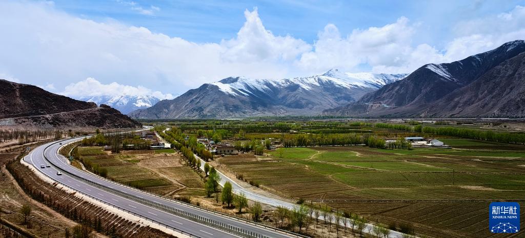 拉萨市达孜区塔杰乡的田野,拉萨至林芝高速公路穿行其中(手机照片,4月30日摄)。 春天的雪域高原,一半是冬的曲调,一半是春的歌咏。只此青绿,江山竞秀。 新华社记者 沈虹冰 摄