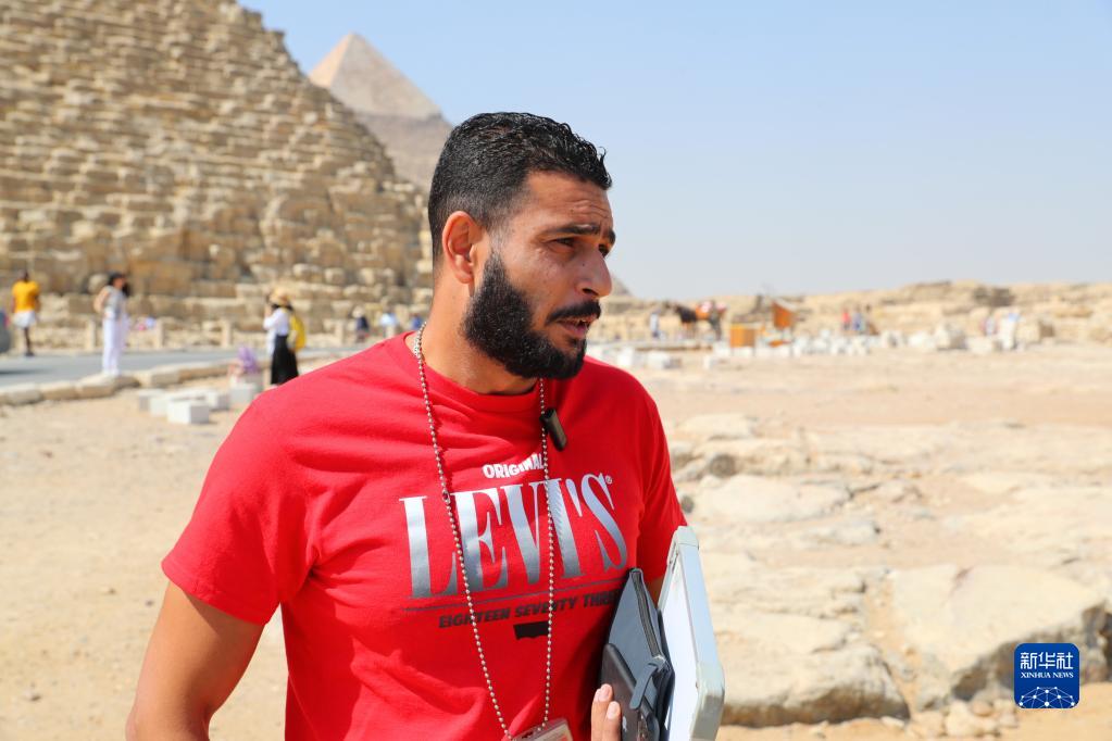 5月1日,埃及导游阿姆鲁·蒂蒂在吉萨金字塔群景区介绍埃及旅游现状。新华社记者 隋先凯 摄