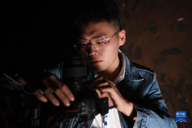 敦煌研究院文物数字化保护团队图像采集人员熊业腾在洞窟内调试设备,准备进行壁画图像采集(4月25日摄)。
