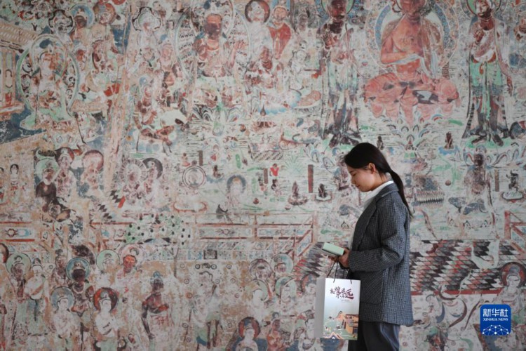 敦煌研究院文物数字化保护团队创意营销人员廖雪婷从一幅高保真复制壁画前走过(4月25日摄)。