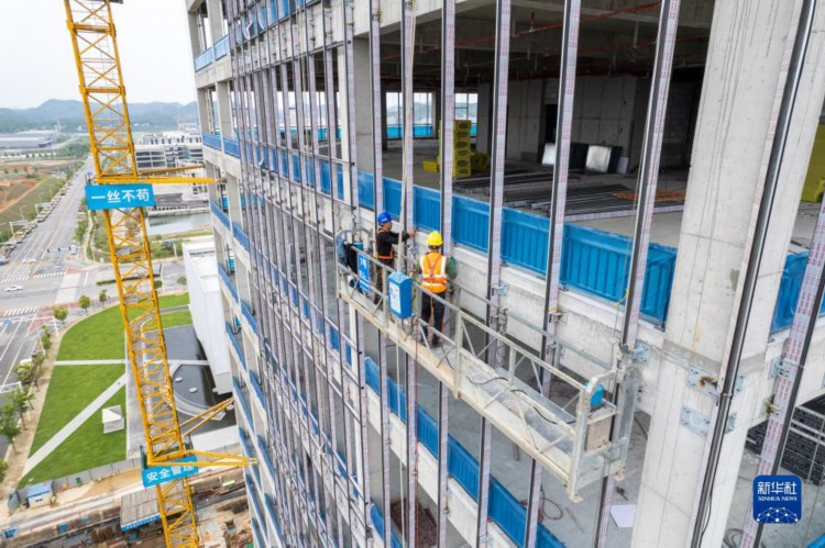 5月3日,工人在湖南长沙智谷项目建设工地为一栋高层建筑安装幕墙(无人机照片)。