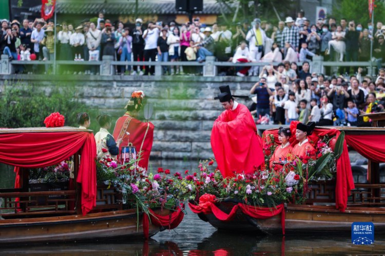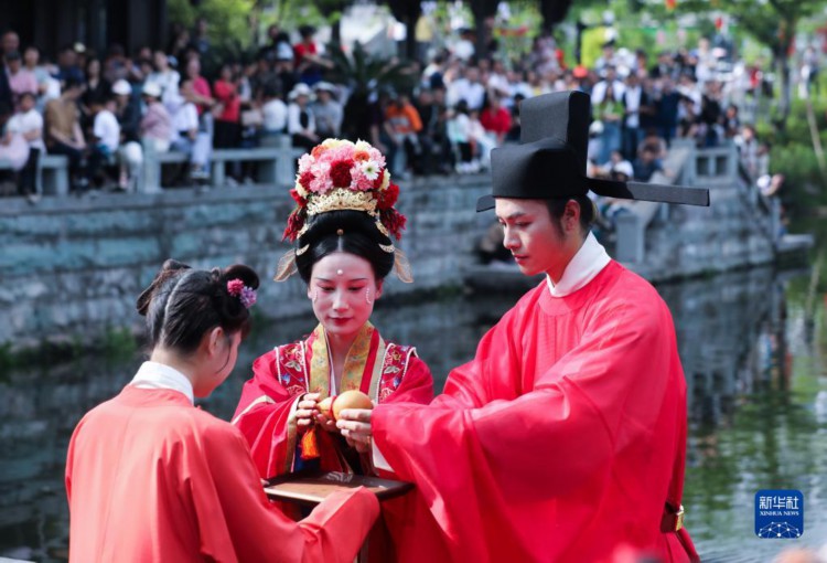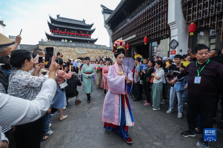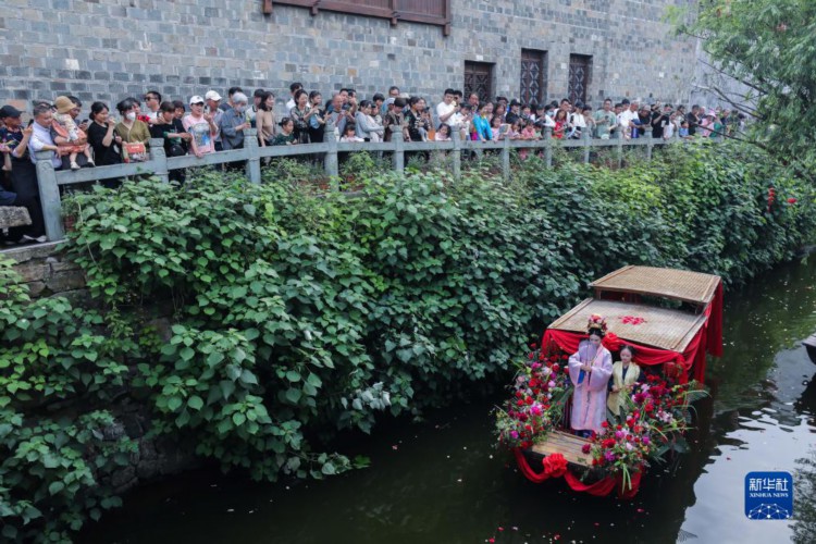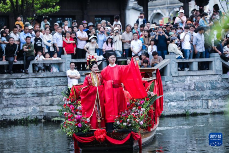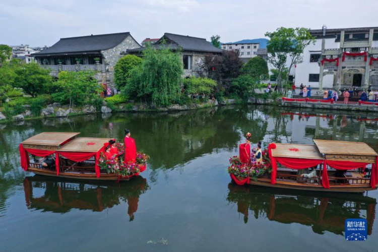 当日,浙江省建德市梅城镇严州古城举行宋韵水上婚礼表演,通过出阁、梳妆、登船、亲迎、礼拜的五幕演绎,吸引了人们驻足观礼。有着1000多年历史的严州古城地处新安江、富春江、兰江交汇处,历史文化积淀深厚。