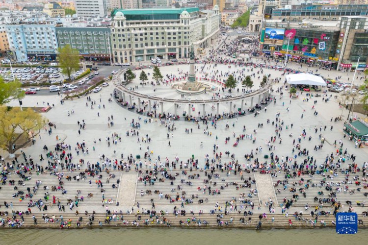 5月3日,人们在哈尔滨防洪纪念塔广场游玩(无人机照片)。 “五一”小长假期间,人们来到各地景区游玩,乐享假期。 新华社记者 张涛 摄