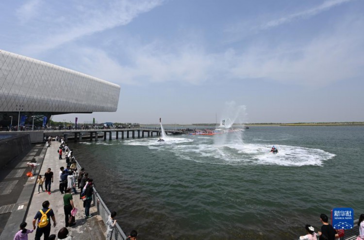 5月3日,游客在位于天津市滨海新区的国家海洋博物馆室外观看水上特技表演。 “五一”小长假期间,人们来到各地景区游玩,乐享假期。 新华社记者 赵子硕 摄