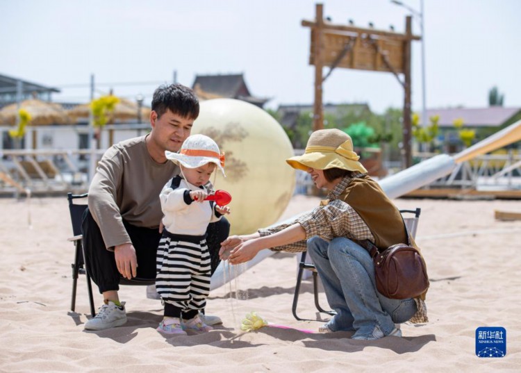 5月3日,游客在天津市滨海新区东疆亲海公园游玩。 “五一”小长假期间,人们来到各地景区游玩,乐享假期。 新华社记者 赵子硕 摄