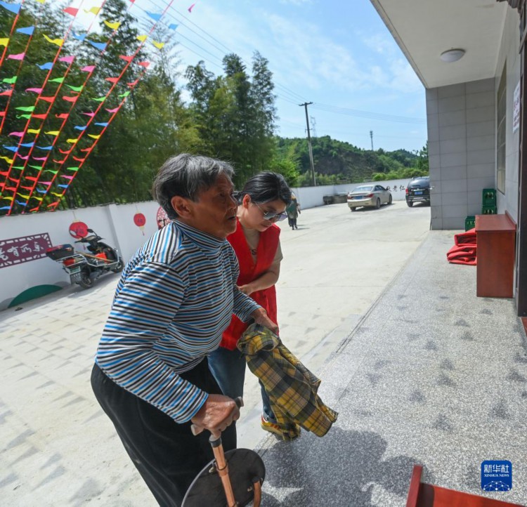 5月4日,东白湖镇党员志愿者为湖山村74岁的盲人低保户郦樟根老人(中)上门配送午餐。 近日,浙江省诸暨市东白湖镇湖山村爱心食堂正式投入使用,这是东白湖镇成立的第18家村级爱心食堂。近年来,东白湖镇开展营养餐定制、志愿者送餐、便民服务进家门等多样化服务,将乡村爱心食堂打造成服务民生新纽带、文明实践新阵地,托起“暖心饭碗”,让乡村老年人在家门口吃出“幸福味”。 新华社记者 徐昱 摄