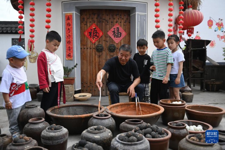 5月4日,村民用黄泥、草木灰等制作传统灰鸭蛋。 临近立夏节气,浙江省杭州市临平区塘栖镇丁山河村的村民们做米塑“立夏狗”、腌灰鸭蛋、搭土灶蒸“野米饭”等,用江南水乡传统的民俗迎接初夏。 新华社记者 黄宗治 摄