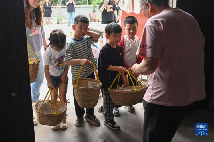 5月4日,小朋友手提竹篮,体验挨家挨户“派野米”的习俗,再用收集到的食材蒸“野米饭”。 临近立夏节气,浙江省杭州市临平区塘栖镇丁山河村的村民们做米塑“立夏狗”、腌灰鸭蛋、搭土灶蒸“野米饭”等,用江南水乡传统的民俗迎接初夏。 新华社记者 黄宗治 摄