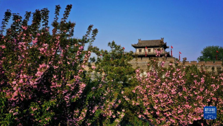 西安城墙掩映在繁花之中(4月1日摄,无人机照片)。